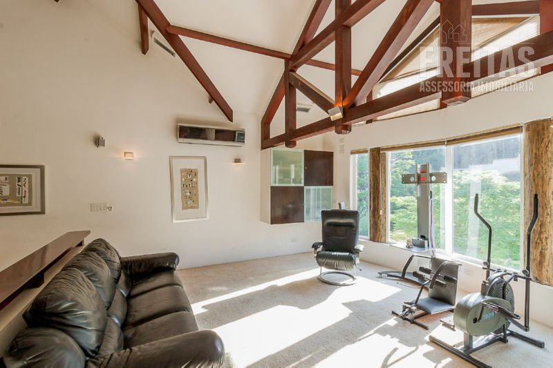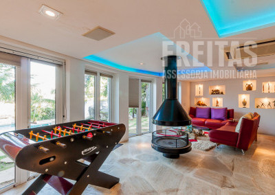 É uma casa, é um sítio e é um resort também, com sauna, vestiários M&F, sala de fitness com 2 enormes visores redondos que dão para o fundo do bar da piscina, área pronta para quadra de beach tenis/vôlei de areia ou society, piscina estilo lagoa de 180 mil litros, (aquecida por 2 trocadores de calor), com ponte, cachoeira de 4 águas e caverna. Um espaço para play-ground e um amplo quiosque gourmet com lugar para sentar mais de 50 pessoas, cozinha gourmet rebaixada com forno&fogão à lenha, churrasqueira, chopeira naja de 2 bicos e