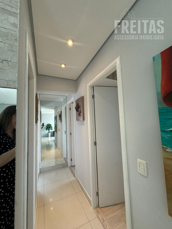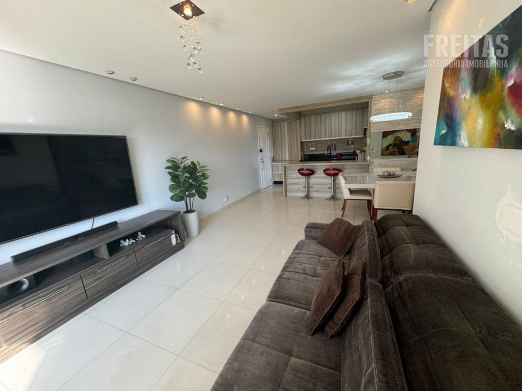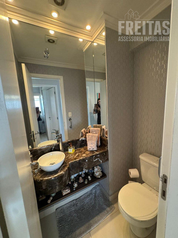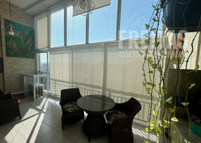 Apartamento em andar alto com 3 dormitórios sendo 1 suíte, ar-condicionado e ventilador de teto, armários planejados, lavabo, área de serviço, varanda gourmet envidraçada e com cortinas e 2 vagas de garagem. Face Norte.