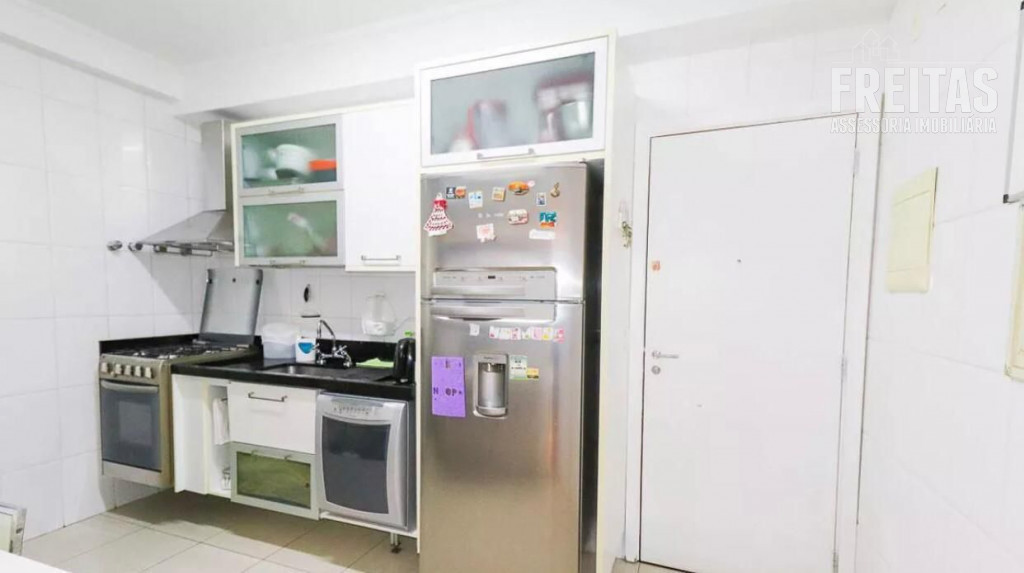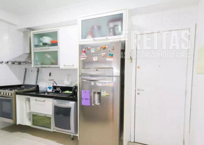 Cozinha completa, equipada com fogão, forno, coifa, geladeira e máquina de lavar