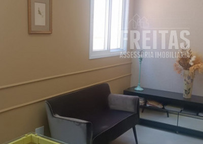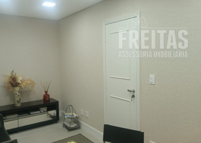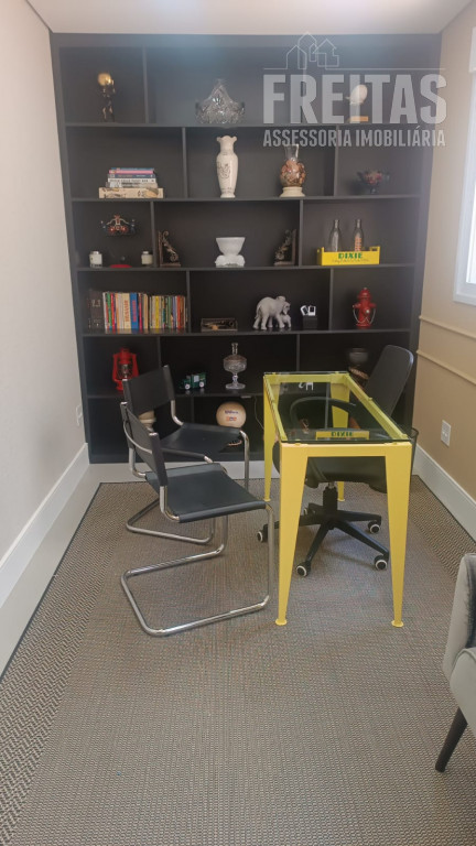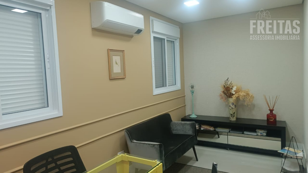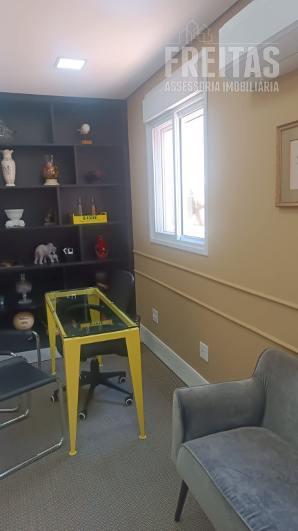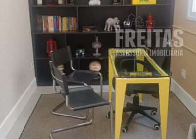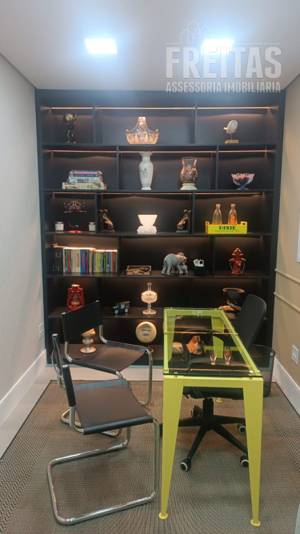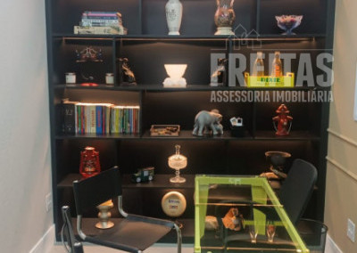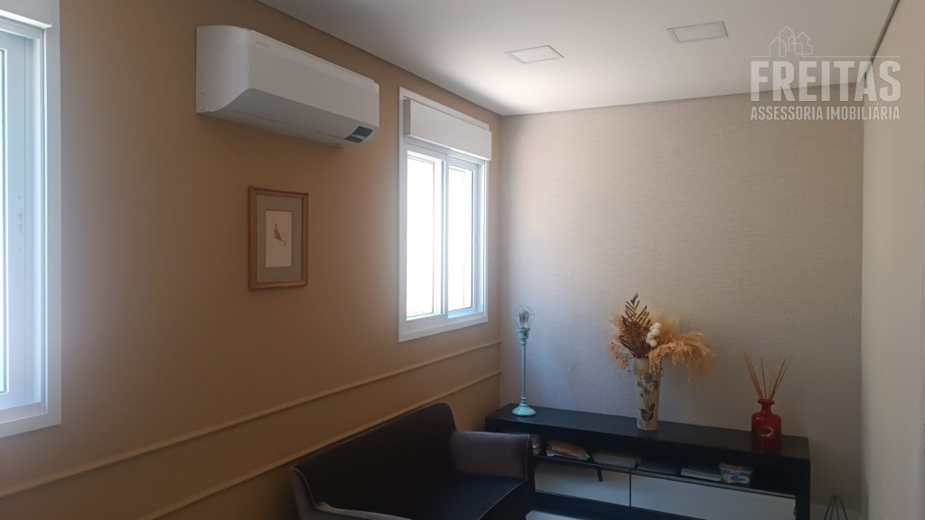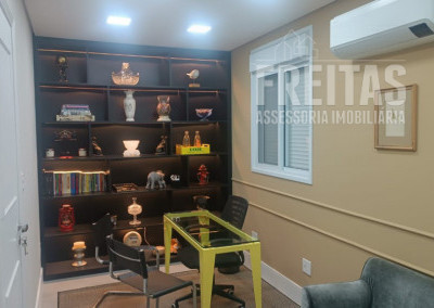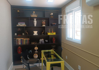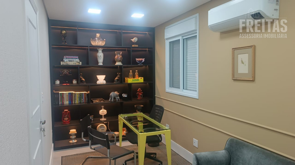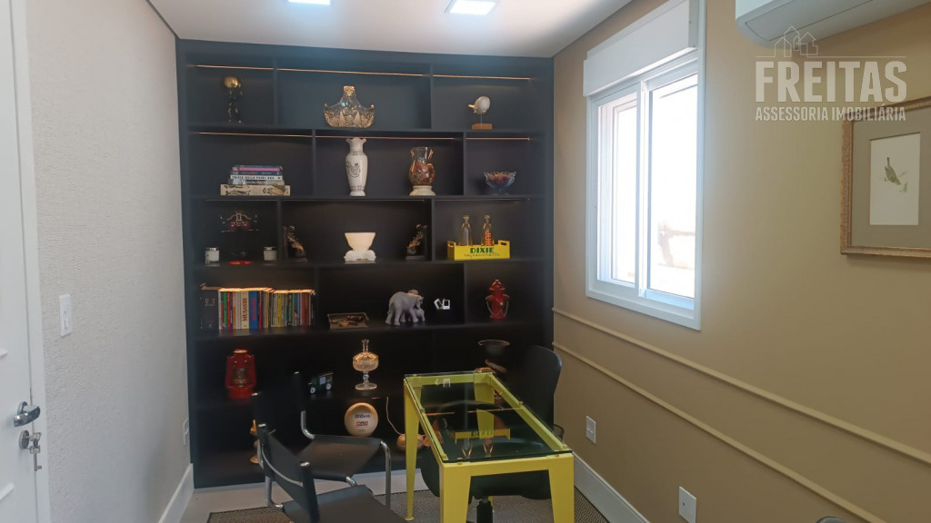HOME OFFICE COM AR-CONDICIONADO 12.000 BTUs, FORRO DE GESSO, PISO EM PORCELANATO, PAPEL DE PAREDE, ESTANTE EMBUTIDA, ILUMINAÇÃO EM LED, JANELAS EM ESQUADRIAS DE ALUMÍNIO, COM PERSIANAS EMBUTIDAS, AUTOMATIZADA e COM TELA MOSQUITEIRO.