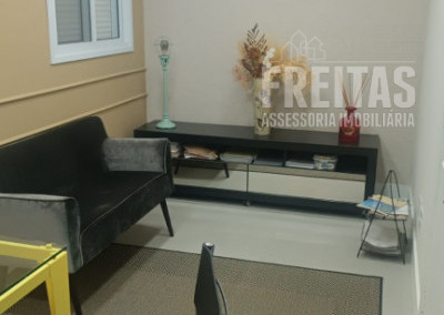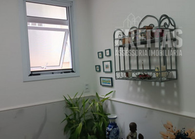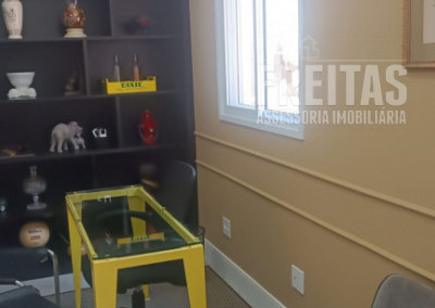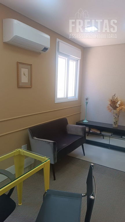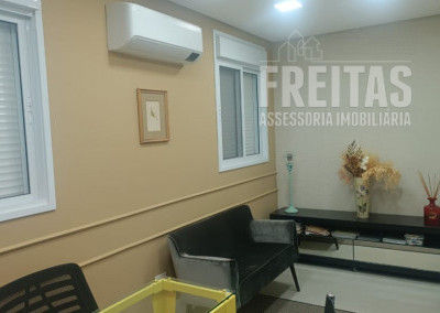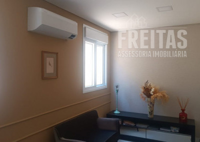SALA PRINCIPAL COM AR-CONDICIONADO DE 22.000 BTUs, FORRO DE GESSO, PISO EM PORCELANATO, ESQUADRIAS EM ALUMINIO PISO-TETO, COM TELA MOSQUITEIRO e VARANDA