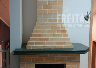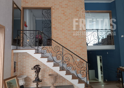 SALA INTIMA COM LAREIRA, PISO EM PORCELANATO, GUARDA-CORPO e ANTEPARRO EM SERRALHERIA ARTISTICA