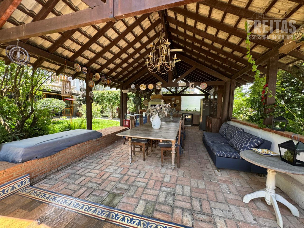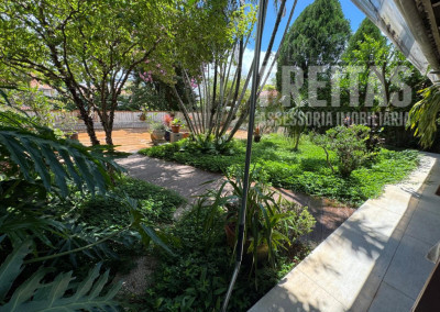 Localizada em uma alameda tranquila, esta casa valoriza a integração dos ambientes e o contato com a natureza. O living iluminado conecta-se às varandas que se abrem para o jardim, criando fluidez e acolhimento nos espaços sociais. A sala de jantar apresenta atmosfera agradável e bem distribuída, favorecendo momentos de convivência. Na área externa, a ampla varanda com deck e espaço gourmet oferece diferentes possibilidades de uso e contemplação, completando o projeto com elegância e funcionalidade.