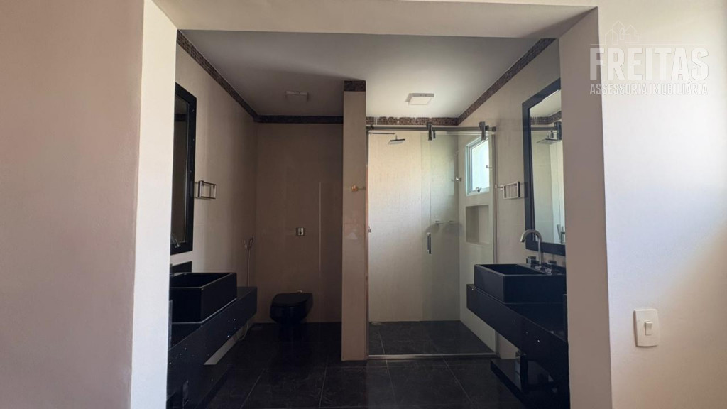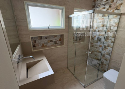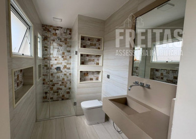 Banheiros em porcelanato e bancadas em silestone e madeira