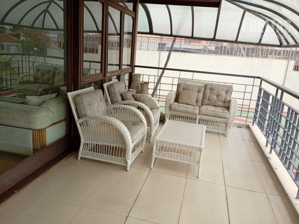Este andar intermediário conta, ainda, com sala de TV, depósito (que também pode ser transformado em quarto para deficiente físico/cadeirante ou PCD com dificuldade de locomoção, por se encontrar no nível das entradas da rua), amplo living, sala de jantar com mesa para 12 lugares, bar, living menor com lareira, ampla varanda com vista para o pôr do sol, lavabo, copa, cozinha, dois depósitos de utensílios, área de serviço, despensa, banheiro de funcionários, quintal e acesso para dependências de funcionários, que são compostas por um apartamento com dois quartos, banheiro, sala de TV e tanque, que fica localizado em espaço que traz privacidade aos funcionários e moradores da casa.