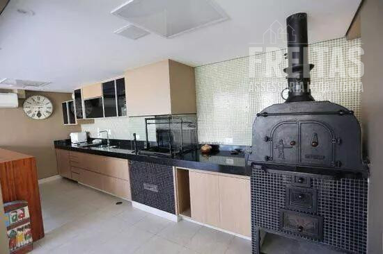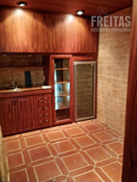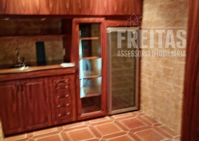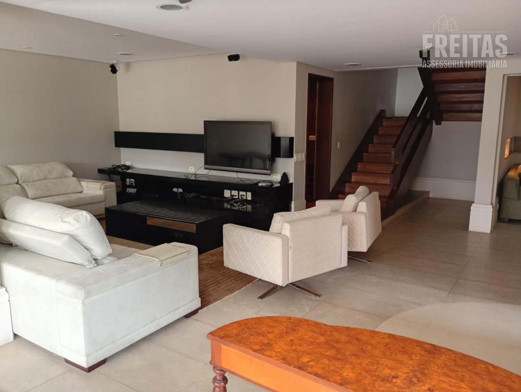 O andar inferior possui uma ampla sala de TV, bar com mesa de jogos, sala de lareira, home theater (o ambiente fica bem escuro, pois possui cortina blackout e porta de correr com ótima vedação de iluminação), lavabo e espaço com adega climatizada, armários e mesa de degustação.